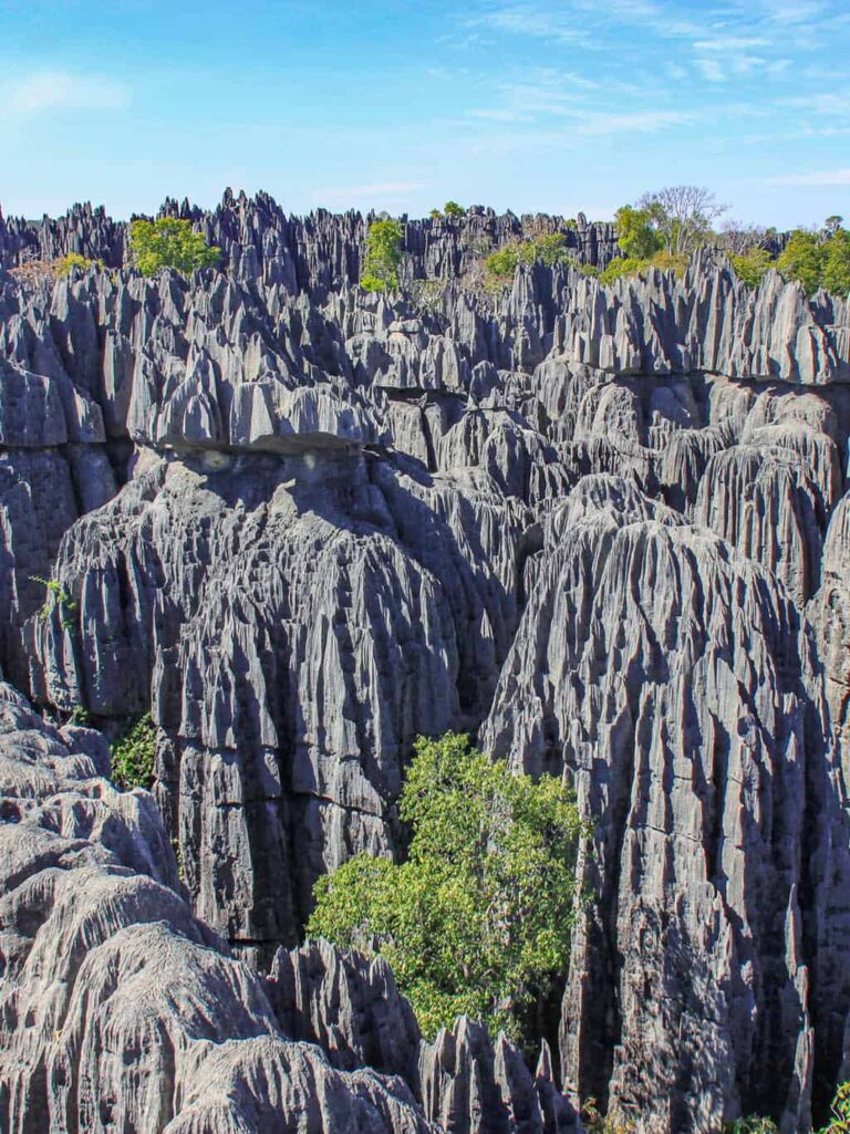 Messerscharf sind die grauen Kalknadeln und -zähne, zwischen denen wir wandern. Manche dieser „Tsingy“ wirken wie gotische Bauwerke, die jemand mit einem Überschuss an Kraft zusammengeschoben hat; andere gemahnen an gespenstische Gestalten mit Kapuzen auf dem Kopf. „Tsingy“ heißt wörtlich „wie auf Zehenspitzen gehen.“ Gut, dass wir feste Schuhe anhaben, schließlich sind wir keine Lemuren – viele dieser endemischen Tiere springen einfach zwischen den scharfen Felsen umher. Tief unter der tropischen Hitze, die über diesem steinernen Meer liegt, dehnen sich Höhlen und kilometerlange Gänge aus, ja sogar unterirdische Seen. Die Gräber an der Mündung des Manambolo-Flusses gelten den Einheimischen als heilig.