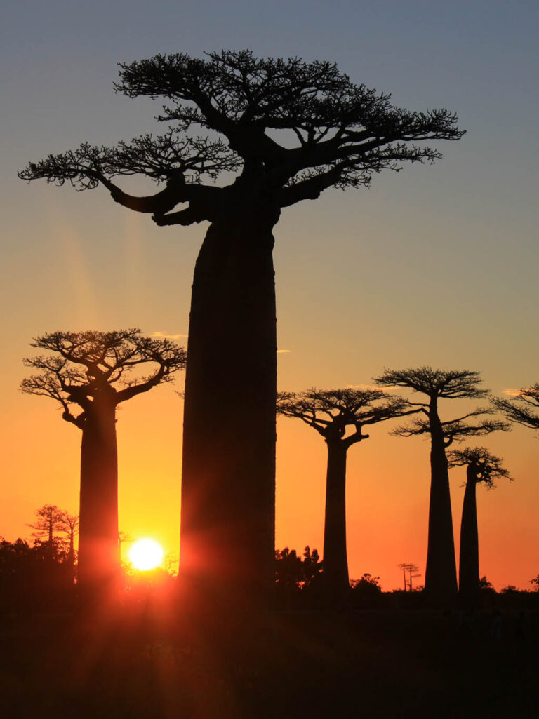 In Madagaskars Westen sind tropische Wälder und Alleen aus Baobab zu entdecken – jenen Bäumen, die aussehen, als würden sie ihre Wurzeln Richtung Himmel strecken. Und überall Tierarten, die es nirgends sonst auf der Erde gibt, wie das Aye-Aye mit seinen langen Spinnenfingern. Auch Reisterrassenfelder, Thermalquellen und kleine Lagunen besuchen wir.