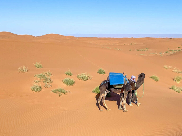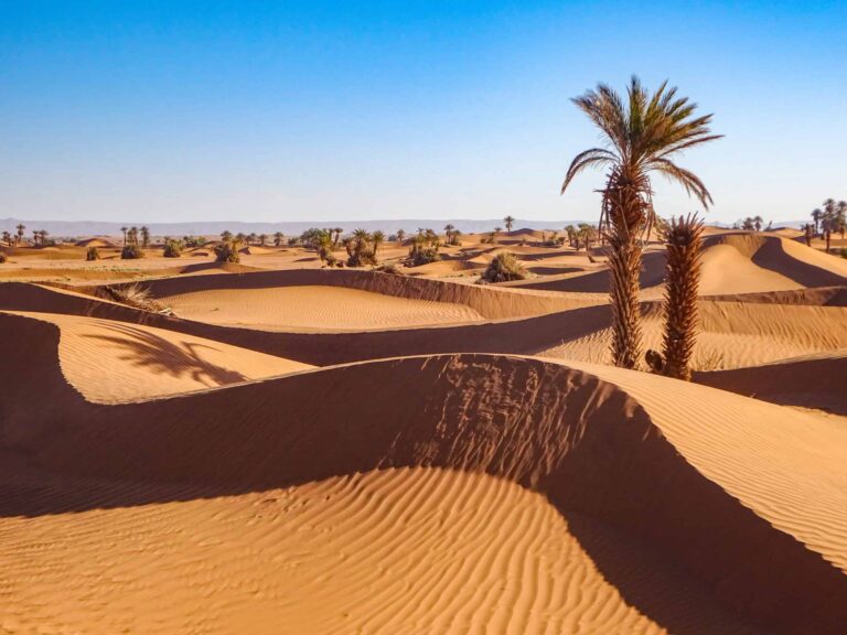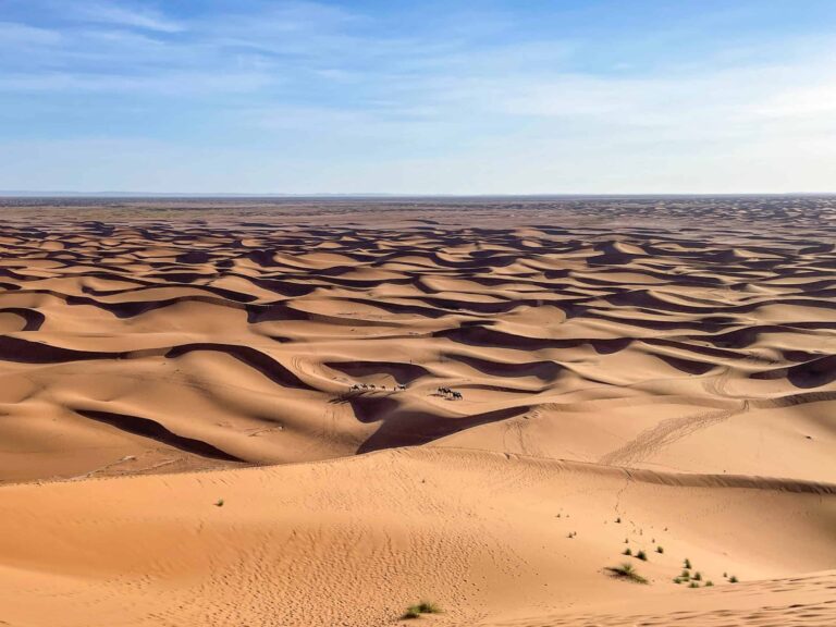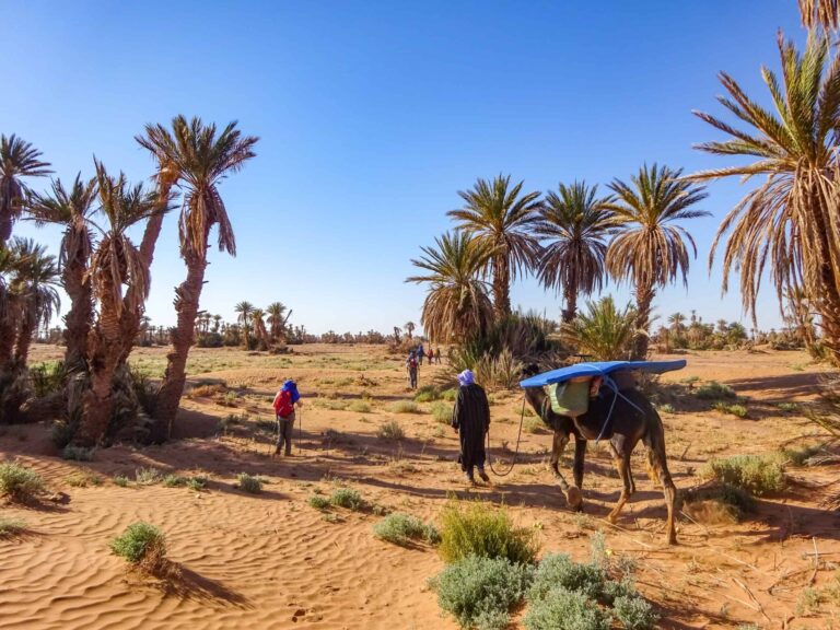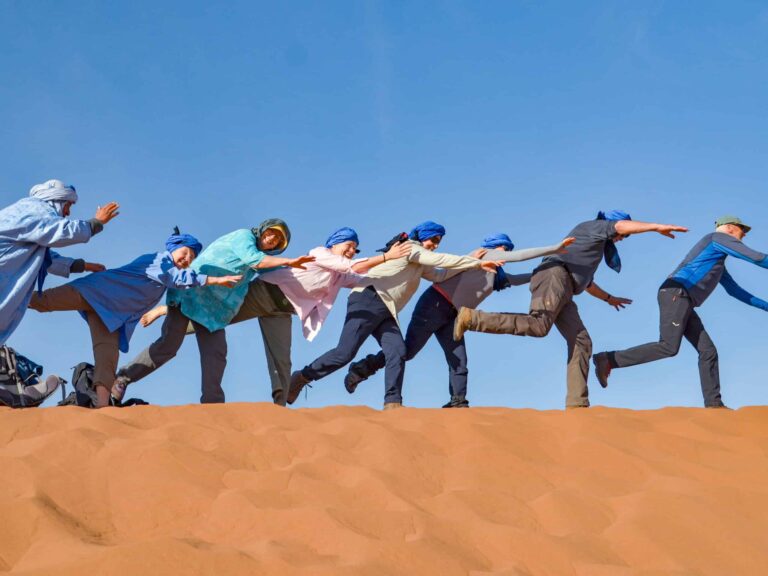 Über das Atlasgebirge mit seinen schneebedeckten Gipfeln fährt die Gruppe in Richtung Sahara. Südlich von Zagora, dem „Tor zur Wüste“, zeichnen sich bereits erste Dünen am Horizont ab. Bei der Oase von M’Hamid bezieht die Gruppe ihr erstes Camp. Gerhard erinnert sich noch genau an den Ausblick: „Die tief stehende Sonne, davor die Palmen als dunkle Silhouetten – das war ein gigantischer Moment!“