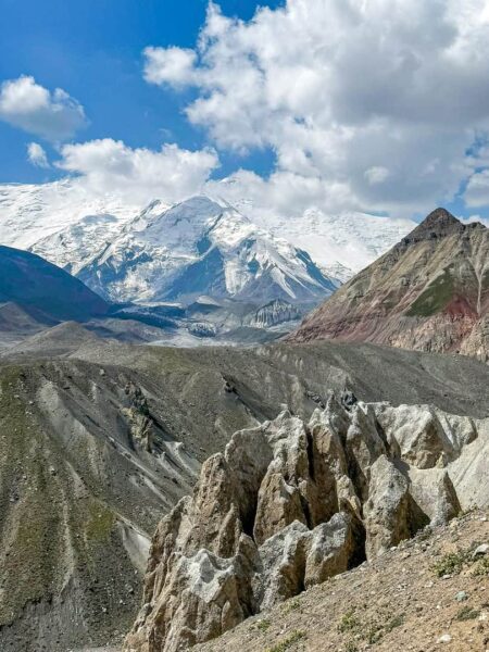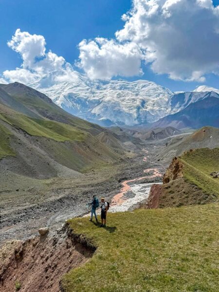 Die Wandererfahrung in Kirgistan ist besonders durch die beeindruckenden Höhenlagen und die landschaftliche Vielfalt geprägt. Große Teile des Landes liegen auf mehr als 3.000 Metern Höhe, mit Gipfeln, die bis zu 7.000 Meter erreichen. Die Wanderungen führen oft über Grasmatten und bieten spektakuläre Aussichten. Vom Yuhina Peak auf 5.130 m blicken wir auf den imposanten Peak Lenin im nördlichen Pamir. Diese einzigartige Hochgebirgslandschaft bietet zahlreiche Trekking-Erlebnisse.