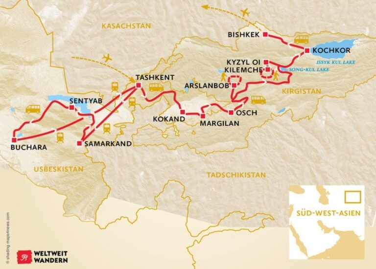 Abhängig vom Reisetermin beginnt die Wanderreise “Höhepunkte Zentalasiens” entweder in Usbekistan (Route A) oder in Kirgistan (Route B). Weitere Details zu den Routen sind in unseren Download-Informationen zu finden.