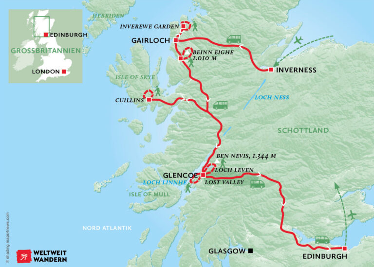 Die Highlands von Schottland sind eine der letzten noch wenig erschlossenen Regionen unseres Kontinents. Uns zeigen sich die Nordwestküste mit ihrer reichen Fauna sowie die umliegenden Gebirgslandschaften von ihrer besten Seite. Hochmoore, Seen, Gebirgszüge und die tiefen Lochs können hier entdeckt werden. Umgeben von sich steil empor ragenden Bergen, Mooren und Wäldern sind wir in der berühmten Region um Glenoce Teil des West Highland Ways, der uns in Richtung des Ben Nevis, dem höchsten Berg der Insel, führt.
