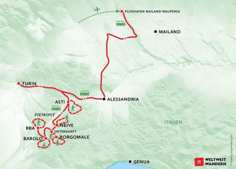 Im Piemont haben wir die Möglichkeit, die berühmten Barolo- und Barbaresco-Weine sowie den typischen Risotto zu probieren, während wir die landschaftliche Schönheit der Region auf unseren Wanderungen genießen.