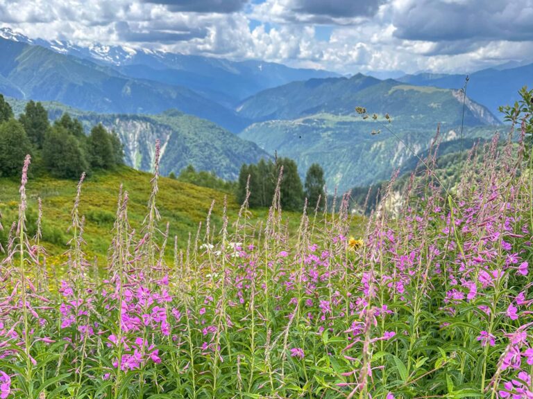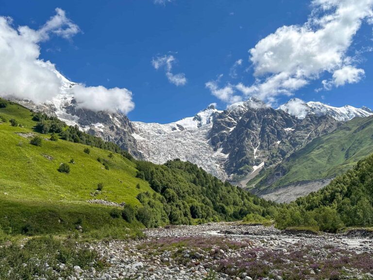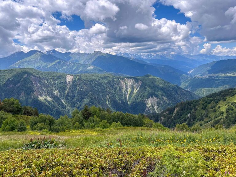 Kurz darauf erlebt Angelo ein absolutes Highlight der Reise. Fünf Tage lang wandert die Weltweitwandern-Gruppe in Swanetien von Dorf zu Dorf. Die historischen Wehrtürme sind stets in Sichtweite, während es vorbei an endlosen Wiesen geht und die Gruppe mit einzigartigen Blicken auf die Gletscher des Kaukasus belohnt wird.
